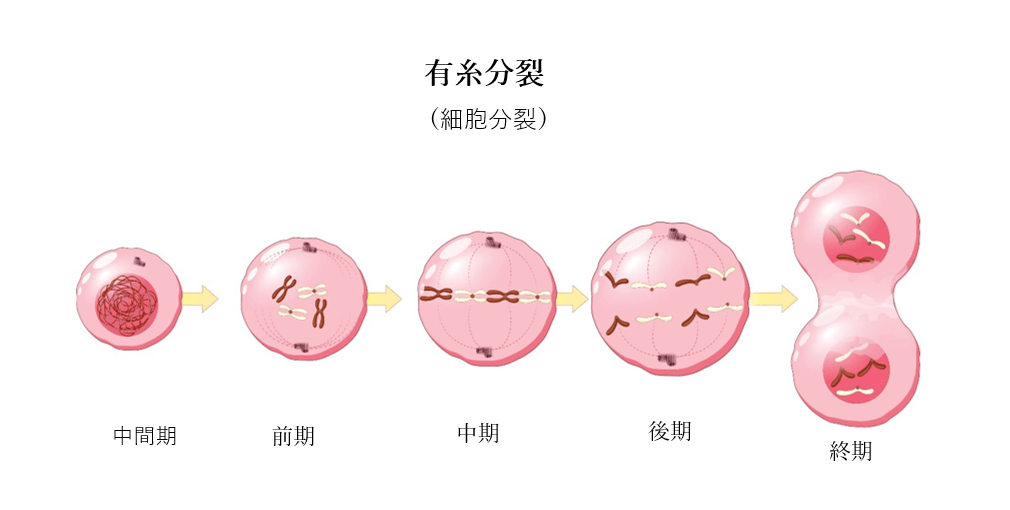 真皮のすぐ上にある基底層では、幹細胞によって絶えず新しい細胞が作られている。 新しい細胞は、有糸分裂(細胞分裂)の過程において作られる。 有糸分裂の5つの段階を以下の図で示す。 有糸分裂の終期に、細胞質が均等に分割され、2つの新しい細胞が形成される