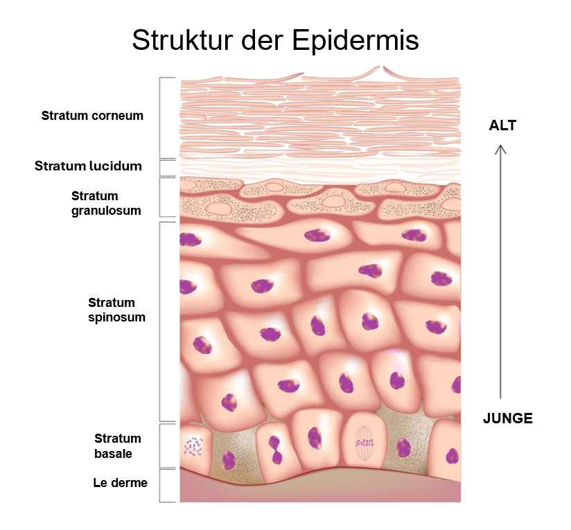 Die oberste Schicht der Haut, die Epidermis, ist in fünf Schichten unterteilt. Die oberste Schicht der Epidermis ist das Stratum corneum. Sie besteht aus abgestorbenen Hautzellen, die mit Keratin gefüllt sind, einem Protein, das auch in Haaren und Nägeln vorkommt. Das Stratum corneum bricht ab und fällt ab, so dass neue Zellen durch die Epidermis nach oben wandern können. Wenn Sie sich das Diagramm unten genau ansehen, werden Sie feststellen, dass das Stratum corneum keine lebenden Zellen enthält.