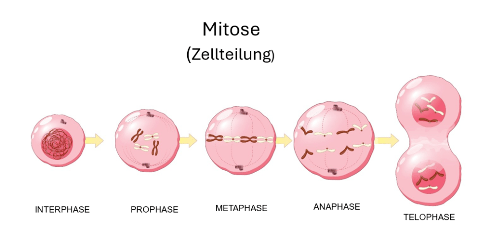 In der Basalschicht (Stratum basale), die direkt über der Dermis liegt, werden ständig neue Zellen von Stammzellen produziert. Neue Zellen werden durch den Prozess der Mitose (Zellteilung) erzeugt. Die fünf Phasen der Mitose sind unten abgebildet. Nach der Telophase wird das gemeinsame Zytoplasma gleichmäßig geteilt und es entstehen zwei neue Zellen.