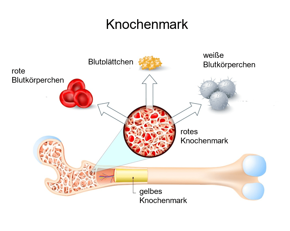 Ohne rotes Knochenmark könnte unser Körper die roten Blutkörperchen, die wir für den Sauerstofftransport benötigen, die weißen Blutkörperchen, die wir zur Bekämpfung von Infektionen brauchen, und die Blutplättchen, die wir zum Stoppen von Blutungen benötigen, nicht produzieren.