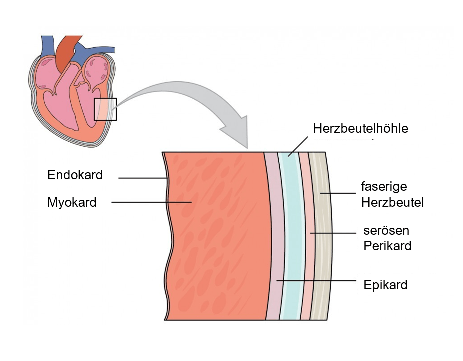 Das Herz ist vom Herzbeutel (Perikard) umgeben, einer dreischichtigen, sackartigen Struktur, die das Herz vor äußeren Traumata und Infektionen schützt. Der faserige Herzbeutel ist die zähe, äußerste Schicht. Er ist mit dem Zwerchfell und dem Brustbein verbunden und stabilisiert das Herz, indem er übermäßige Bewegungen und Überdehnungen verhindert. Das Epikard ist die innerste Schicht des Herzbeutels. Es liegt neben dem Myokard, der mittleren Muskelschicht des Herzens. Die Herzbeutelhöhle liegt zwischen dem Epikard und dem serösen Perikard. Sie ist mit schmierender seröser Flüssigkeit gefüllt, die die Reibung während der Herzkontraktionen verringert.