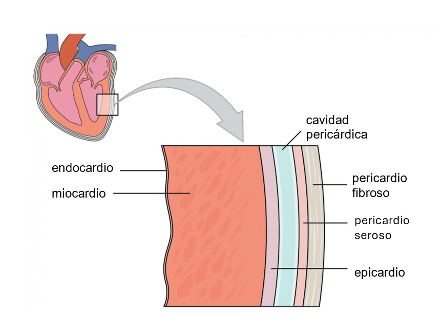 El corazón está rodeado por el pericardio, una estructura en forma de saco de tres capas que lo protege de traumatismos externos e infecciones. El pericardio fibroso es la capa más dura y externa. Unido al diafragma y al esternón, el pericardio fibroso estabiliza el corazón impidiendo el movimiento excesivo y el estiramiento excesivo. El epicardio es la capa más interna del pericardio. Se encuentra junto al miocardio, la capa muscular media del corazón. La cavidad pericárdica se encuentra entre el epicardio y el pericardio. Está llena de líquido seroso lubricante que reduce la fricción durante las contracciones del corazón.