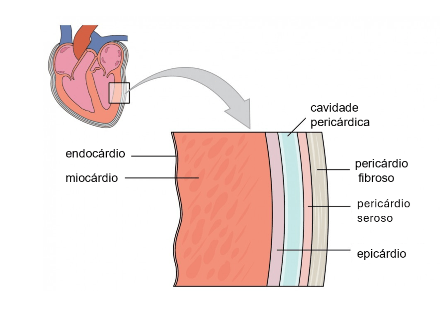 O coração está rodeado pelo pericárdio, uma estrutura semelhante a uma bolsa de três camadas que protege o coração de traumatismos externos e infeções. O pericárdio fibroso é a camada mais externa e resistente. Ligado ao diafragma e ao esterno, o pericárdio fibroso estabiliza o coração, evitando movimentos excessivos e alongamentos excessivos. O epicárdio é a camada mais interna do pericárdio. Encontra-se adjacente ao miocárdio, a camada muscular média do coração. A cavidade pericárdica fica entre o epicárdio e o pericárdio seroso. Está cheio de fluido seroso lubrificante que reduz o atrito durante as contrações cardíacas.