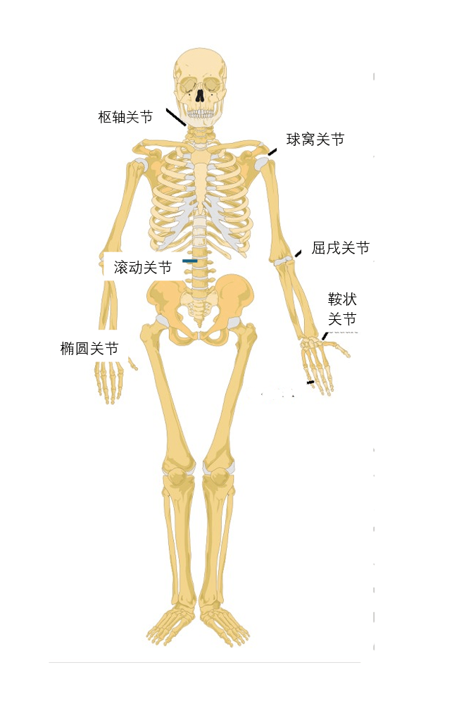 枢轴关节位于头两节颈椎之间,即寰椎(C1)和轴椎(C2)。 通过这个关节,头部可以前后和左右移动。 枢轴关节也位于肘部附近和腕部附近,允许前臂和腕部旋转运动。肘关节、膝关节和踝关节都属于铰链关节。 它们只能进行弯曲和伸直运动。