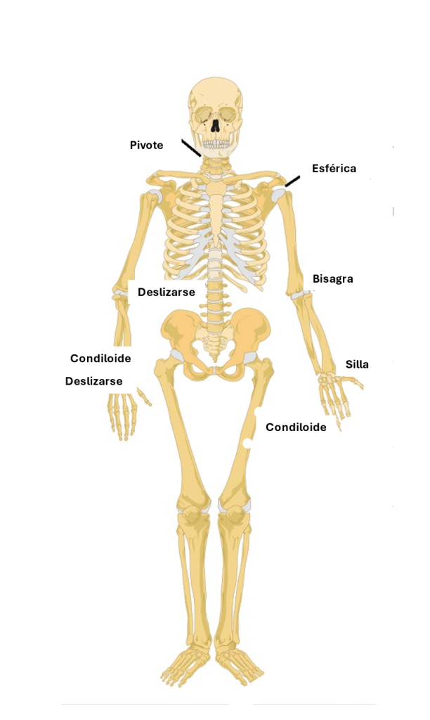 La articulación pivotante está situada entre las dos primeras vértebras cervicales, el atlas (C1) y el axis (C2). Esta articulación permite que la cabeza se mueva hacia delante y hacia atrás y de un lado a otro. También hay una articulación pivotante cerca del codo y cerca de la muñeca, que permite movimientos de rotación del antebrazo y la muñeca. El codo, la rodilla y el tobillo son ejemplos de articulaciones de bisagra. Sólo permiten movimientos de flexión y enderezamiento.
