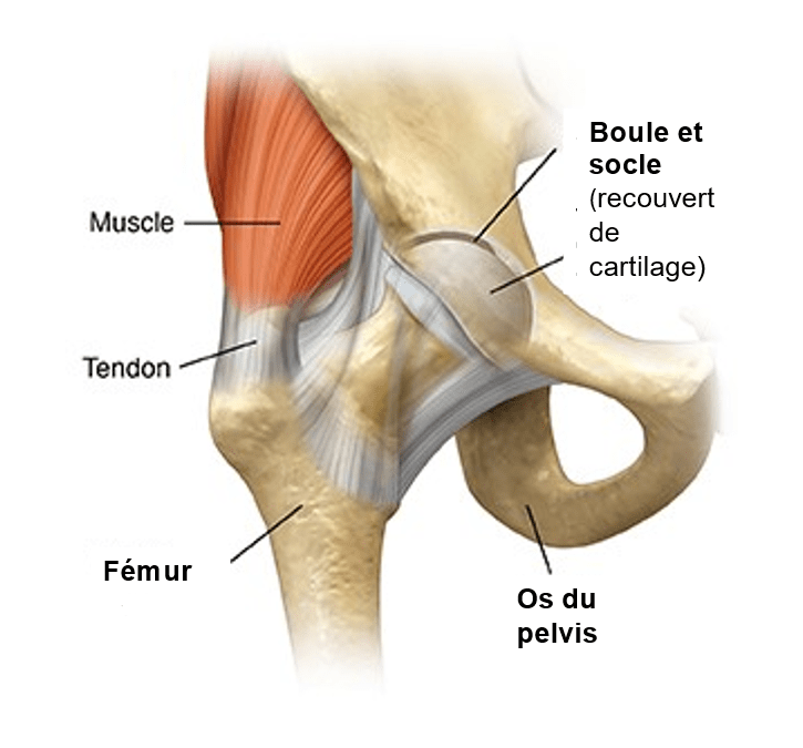 L’articulation de la hanche se forme à l’endroit où la tête arrondie du fémur rejoint l’os du bassin. L’articulation est recouverte de tissus et soutenue par de gros muscles. Lorsque toutes les parties énumérées ci-dessous sont en bonne santé, la hanche devrait bouger facilement.