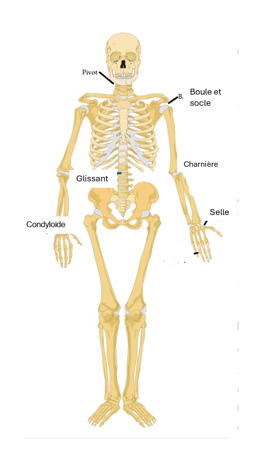 L’articulation pivot est située entre les deux premières vertèbres cervicales, l’atlas (C1) et l’axis (C2). Cette articulation permet à la tête de se déplacer d’avant en arrière et d’un côté à l’autre. Une articulation pivot est également située près du coude et près du poignet, permettant des mouvements de rotation de l’avant-bras et du poignet. Le coude, le genou et la cheville sont des exemples d’articulations charnières. Elles ne permettent que des mouvements de flexion et de redressement.