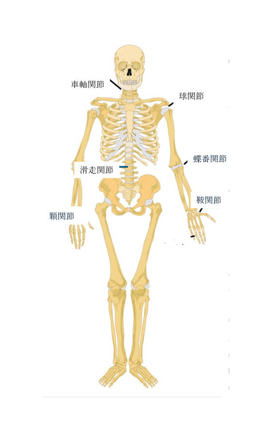 車軸関節は、上から2つの頸椎、環椎(第一頸椎)と軸椎(第二頸椎)に位置している。 この関節により、頭部は前後左右に動くことができる。 車軸関節は肘の近くと手首の近くにもあり、前腕と手首の回転運動を可能にする。 肘、膝、足首は蝶番関節の例を示す。 これらは曲げ伸ばしの動きしかできない。