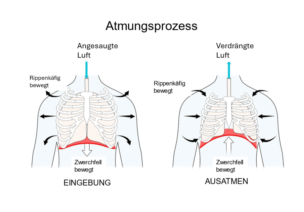 Die Atmung wird willentlich durch Muskeln in Brust und Bauch gesteuert. Das Zwerchfell ist der Hauptmuskel, der für die Atmung zuständig ist. Es ist ein kuppelförmiger Muskel unterhalb der Lunge, der die Brusthöhle von der Bauchhöhle trennt. Wenn Sie ein- oder ausatmen, zieht sich Ihr Zwerchfell zusammen und bewegt sich nach unten. Dadurch vergrößert sich der Raum in der Brusthöhle, so dass die Luft einströmen kann und sich die Lunge ausdehnt. Wenn Sie ausatmen, entspannt sich das Zwerchfell und kehrt in seine kuppelförmige Form zurück. Wenn die Luft aus der Lunge entweicht, entleert sie sich von selbst, ähnlich wie ein elastischer Luftballon sich entleert, wenn er der Luft ausgesetzt wird.