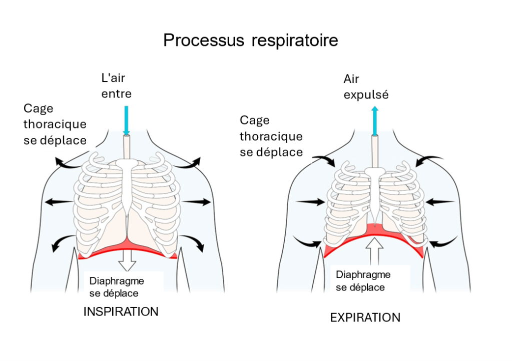 La respiration est volontairement contrôlée par les muscles de la poitrine et de l’abdomen. Le diaphragme est le principal muscle utilisé pour la respiration. Il s’agit d’un muscle en forme de dôme situé sous les poumons, qui sépare la cage thoracique de la cavité abdominale. Lorsque vous inspirez, votre diaphragme se contracte et se déplace vers le bas. Cela augmente l’espace dans la cage thoracique, permettant à l’air d’entrer, ce qui dilate les poumons. Lorsque vous expirez, le diaphragme se détend et reprend sa forme de dôme. Lorsque l’air sort des poumons, ceux-ci se dégonflent d’eux-mêmes, un peu comme un ballon élastique qui se dégonfle s’il est laissé à l’air libre.