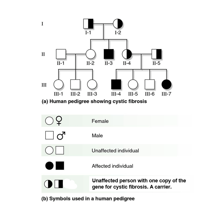 From this pedigree, genetic counselors can advise children in generation III of their chances of having a child with cystic fibrosis. You will notice that cystic fibrosis affects both males and females. And because it is a recessive condition, it often skips one generation.