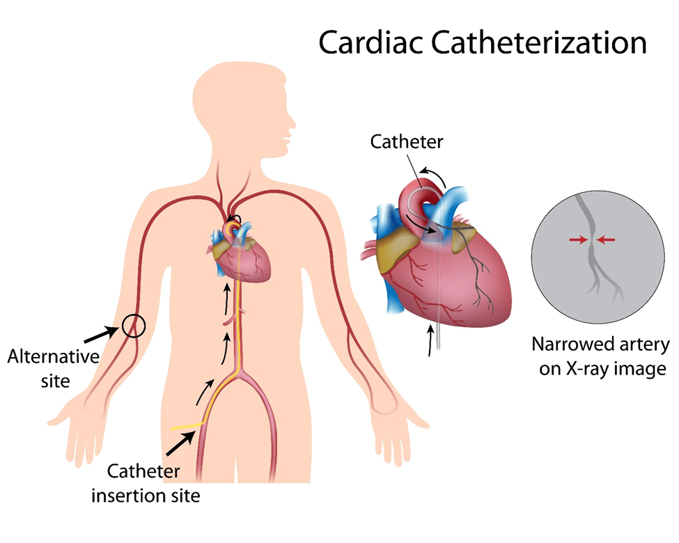 Cardiac catheterization is a test or treatment for certain heart or blood vessel problems, such as clogged arteries or irregular heartbeats. It uses a thin, hollow tube called a catheter. The tube is guided through a blood vessel to the heart. Cardiac catheterization gives important details about the heart muscle, heart valves and blood vessels in the heart.