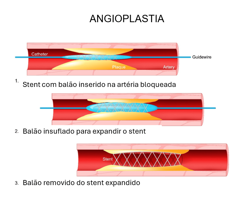 Se o coração do doente tiver uma artéria coronária estreitada, o médico irá realizar uma angioplastia. A angioplastia coronária é um procedimento para abrir vasos sanguíneos obstruídos do coração. A angioplastia coronária trata os vasos, chamados artérias coronárias, que levam o sangue aos músculos do coração. Um pequeno balão num tubo estreito, chamado cateter, é utilizado para alargar uma artéria obstruída e melhorar o fluxo sanguíneo.
