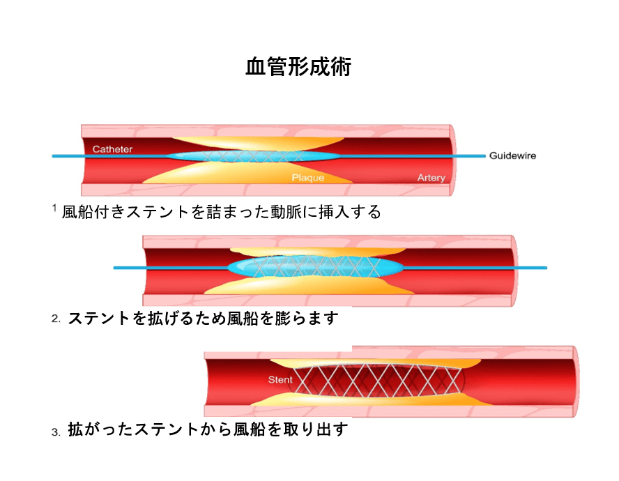 患者の心臓に冠動脈の狭窄が起こっている場合、医師は血管形成術を行う。冠動脈形成術とは、心臓の詰まった血管を開く処置である。冠動脈形成術は心筋へ血液を運ぶ冠動脈と呼ばれる血管を治療する。カテーテルという小さな風船付きの細いチューブが使われ、詰まった動脈を拡げ、血流を改善する。