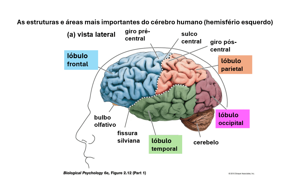 • Área de Broca: Localizada no lóbulo frontal esquerdo, a área de Broca é essencial para a produção da linguagem. Traduz os pensamentos em frases gramaticalmente corretas e coerentes, tanto faladas como escritas.