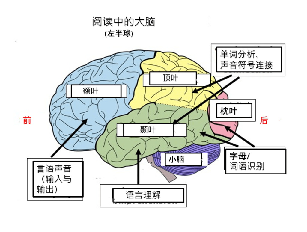 - 顶颞区:负责将书写的词分解成声音,即分析词语、拼读。