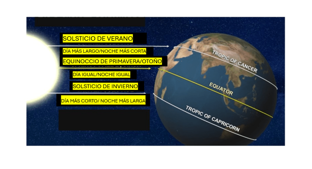 • Solsticio de verano: el Sol incide directamente sobre el Trópico de Cáncer (23,5° N) al mediodía en el hemisferio norte.